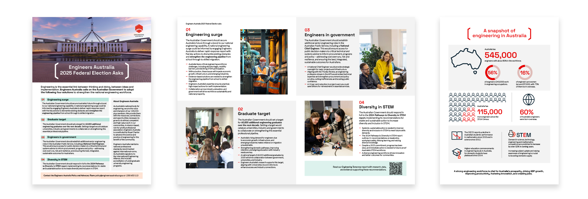 A4 bifold flyer. Engineers Australia calls on the Australian Government to strengthen the national engineering workforce.