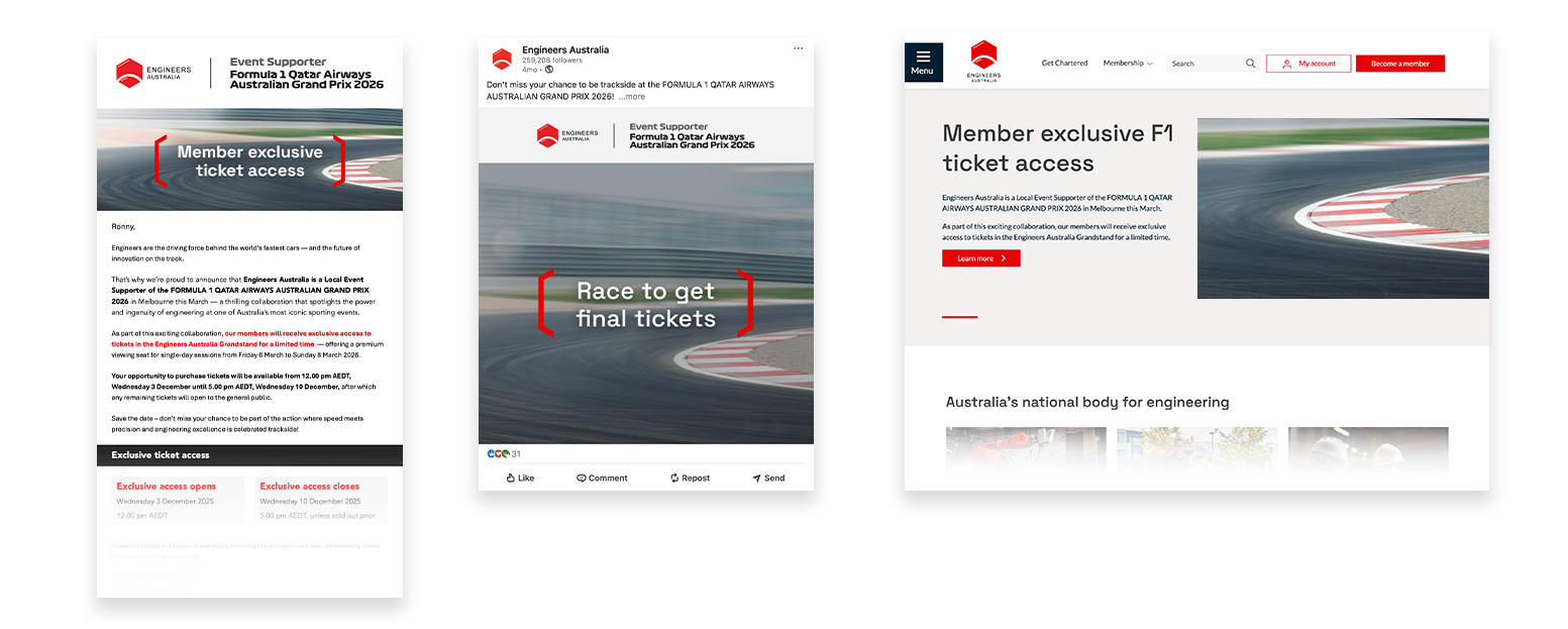 Developed campaign assets promoting member-exclusive F1 grandstand ticket access across email, social and web. Navigated strict F1 brand constraints, including limited image usage rights and restricted logo application. Managed multiple approval layers and long turnaround times within an urgent delivery window, requiring adaptable, compliant design solutions.