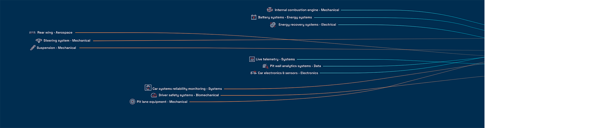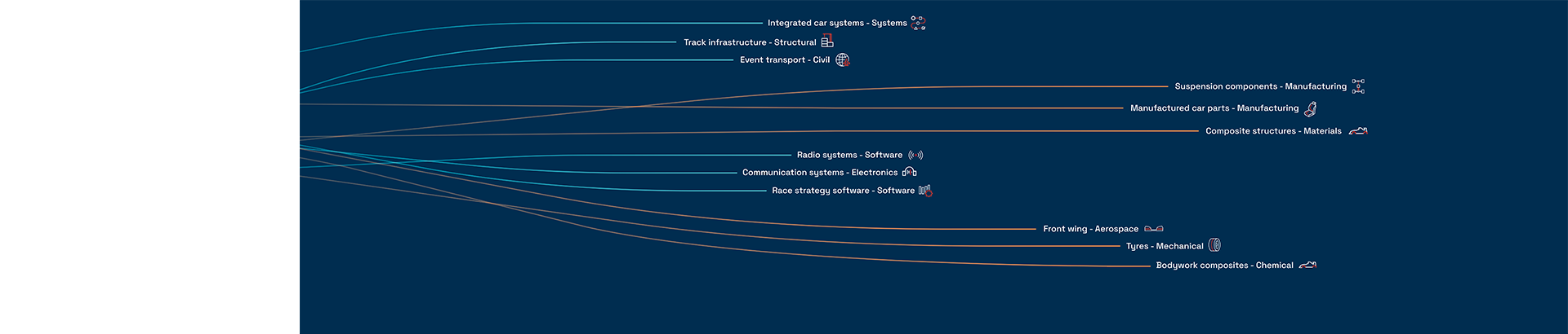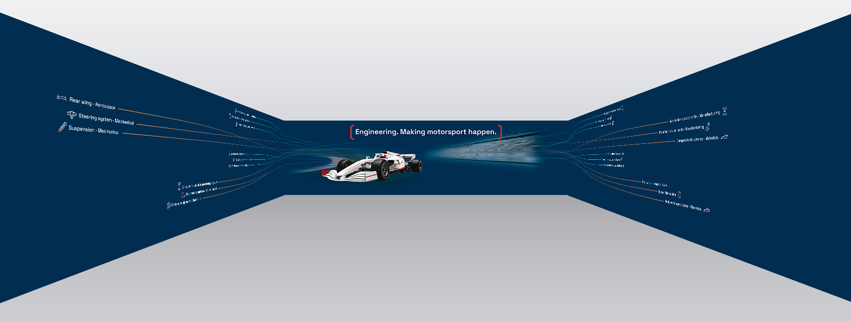 Translated a rough brief into a resolved spatial design, developing the artwork as a system-led visual. Centred on the line “Engineering. Making motorsport happen”, the design frames the car as the focal point and maps the interconnected engineering disciplines that enable performance.